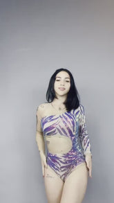 This leotard stands out with its shimmering blue sequins on a nude base, creating a captivating contrast. The asymmetrical design adds a modern touch, making it perfect for performers and those who love unique fashion. It has the ideal blend of aesthetics and maximum comfort.